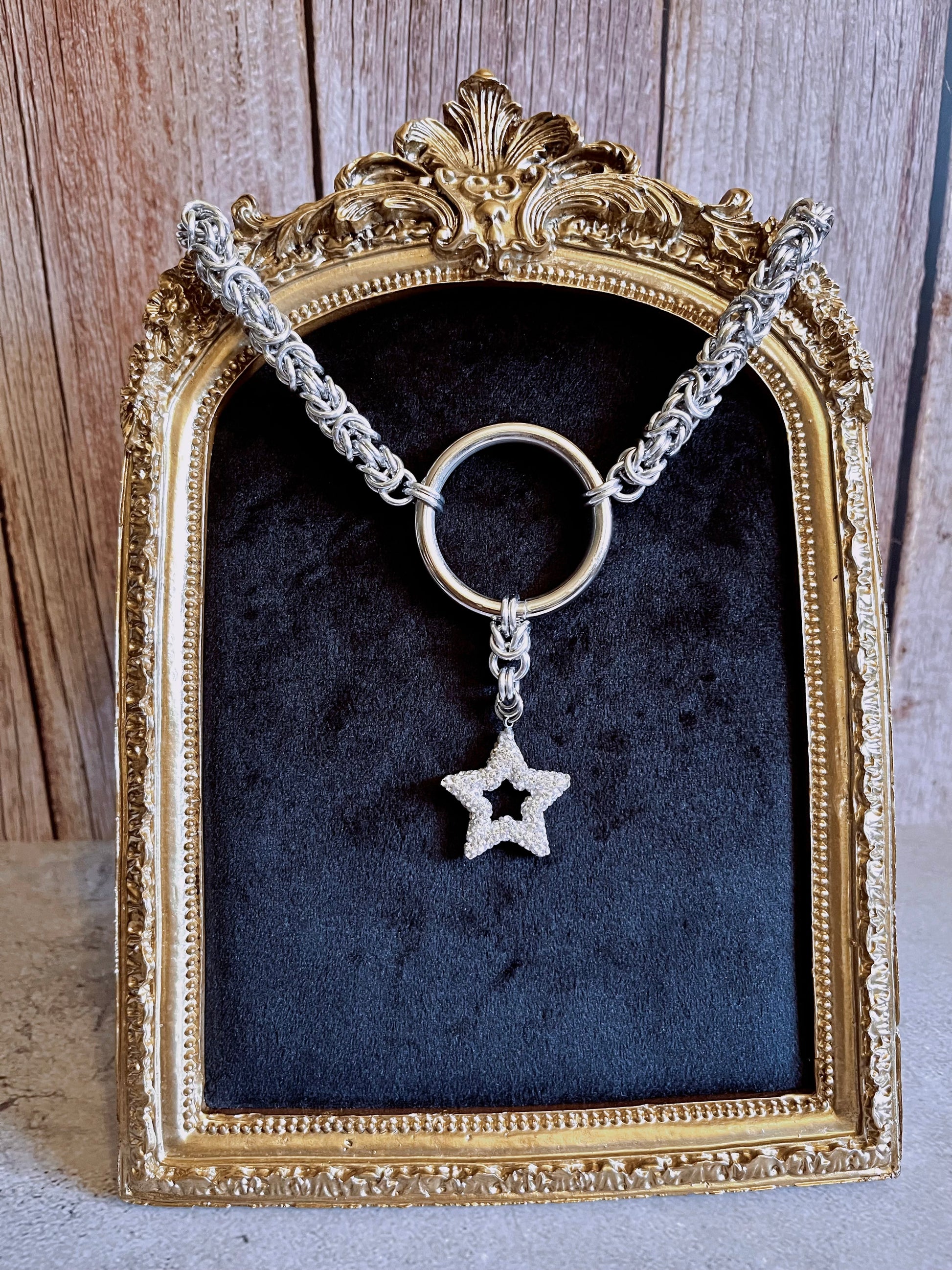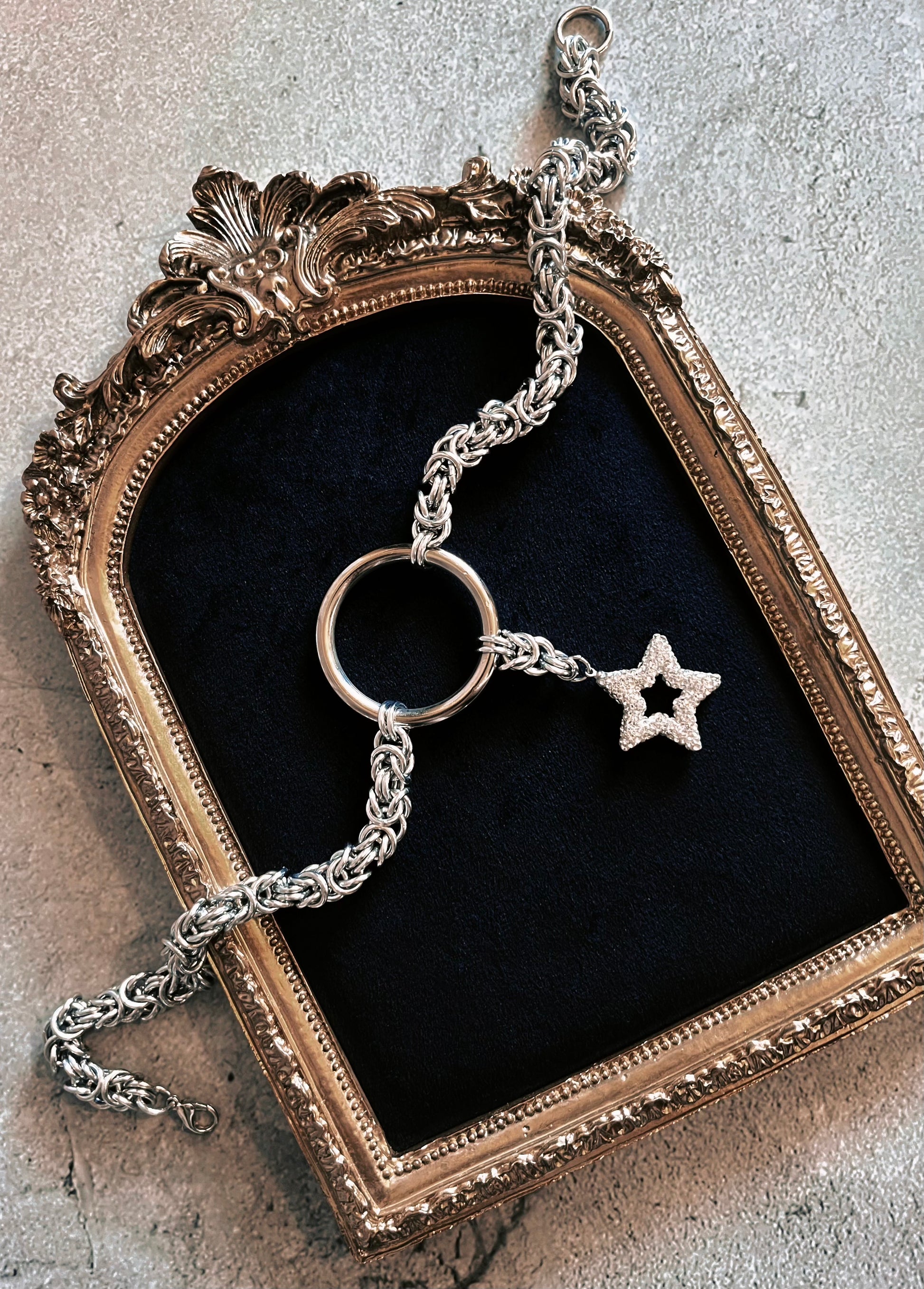 In an old tale, it's said the stars used to hide from humans, they fell silent so their names could not be spoken…tucked away inside the indigo velvet void. There was one that still had faith in us...so it spoke its name and allowed itself to be bound by these softly charmed loops of metal. It still remembers the pattern of the night…it uses its divine powers to guard whoever is brave enough to wear it, it’s a beacon of hope to those who have still faith.